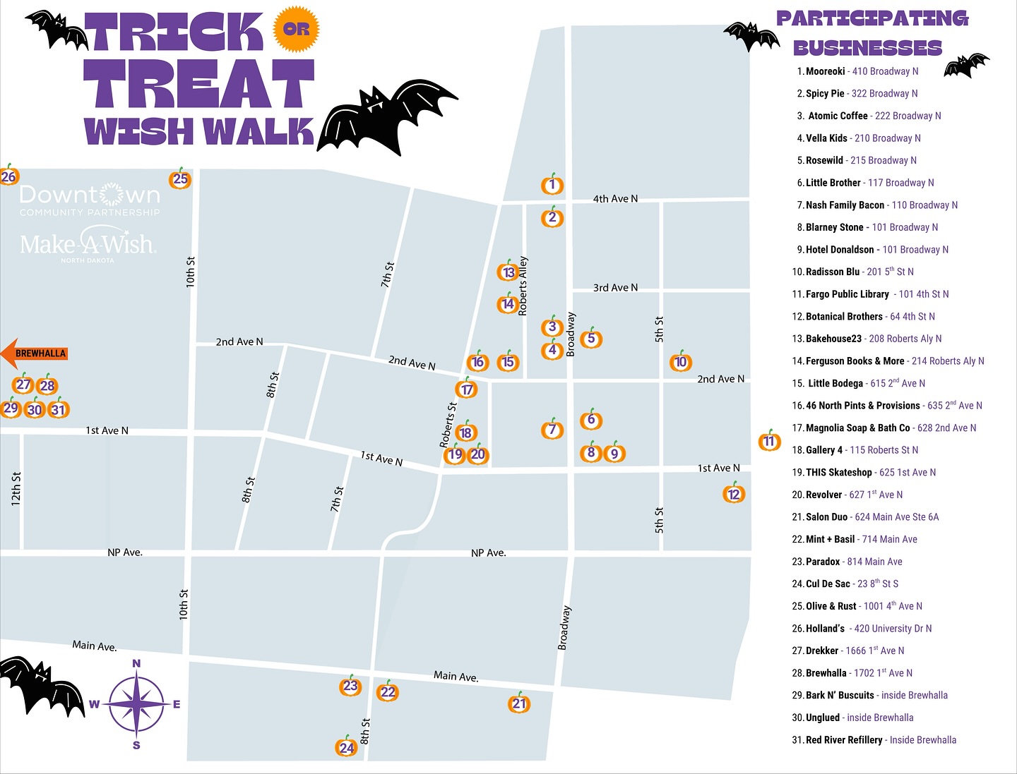 First held in 2017, the Trick or Treat Wish Walk is a family-friendly Halloween event hosted by the Downtown Community Partnership in collaboration with participating Downtown businesses — with 100% of proceeds donated to Make-A-Wish North Dakota.